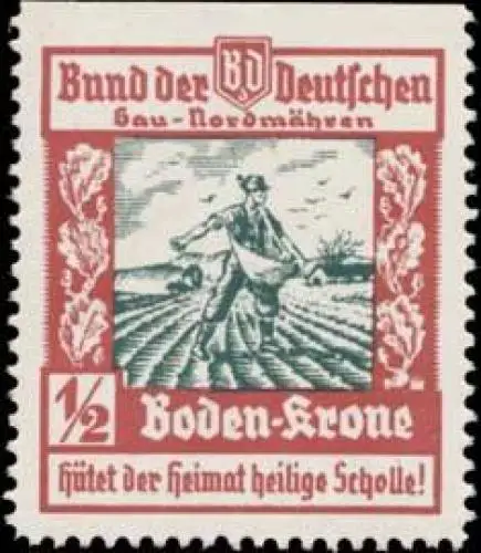 Gau-Nordmähren. Hütet der Heimat heilige Scholle! Spendenmarke, Boden-Krone, Landwirtschaft, Ostrau, Mähren, Größe/Zustand: 4x3 , guter Zustand, Original alte Reklamemarke die seinerzeit für die Werbung benutzt wurde