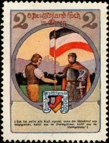 Oh Deutschland - Hoch in Ehren. Daß sich unsre alte Kraft erprobt, wenn der Schlachtruf uns entgegentobt, haltet aus im Sturmgebraus, haltet aus im Sturmgebraus. Spendenmarke, Größe/Zustand: 5x4 , guter Zustand, Original alte Reklamemarke die seinerzeit für die Werbung benutzt wurde