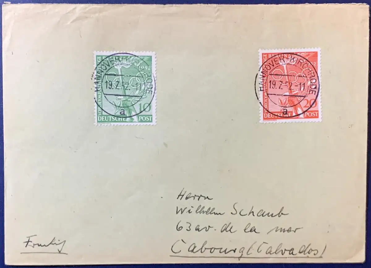 Bedarfsbrief, Bund, frankiert mit Berlin Mi.Nr. 89 + 90, gelaufen mit Poststempel vom 19.07.1952 von Hannover nach Cabourg/Frankreich, Brief ist gut erhalten, saubere, zentrale Stempel.