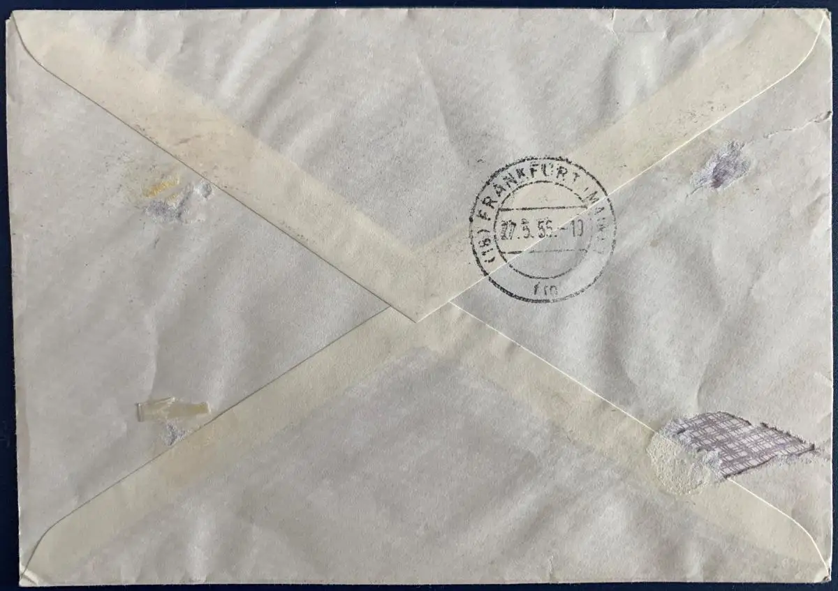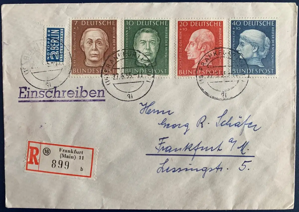 Frankiert mit Mi.Nr. 200 - 203 (Helfer der Menschheit) und Notopfer, gelaufen mit Poststempel vom 27.05.1955 in Frankfurt a.M.