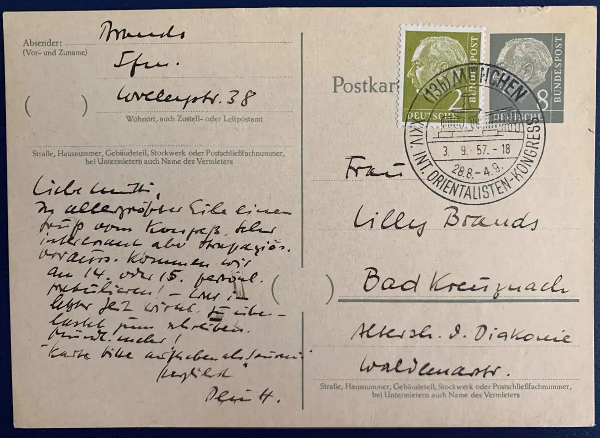 Postkarte, gelaufen mit sehr schönem Sonderstempel (XXIV. Int. Orientalisten-Kongress) vom 03.09.1957 von München nach Bad Kreuznach, Karte ist sehr gut erhalten, sehr sauber gestempelt!