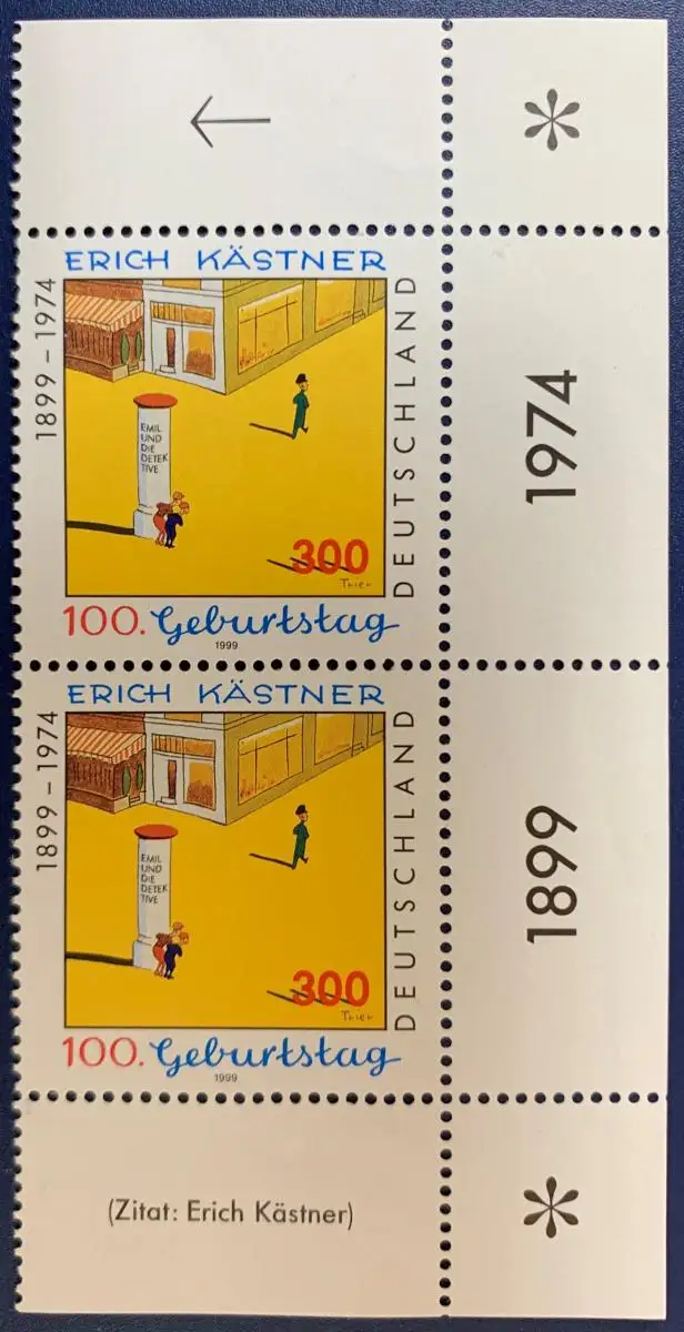 Briefmarke "100. Geburtstag Erich Kästner", zwei Marken, Mi.Nr. 2035, Eckrandstück rechts aus dem Kleinbogen, einwandfreie Erhaltung.