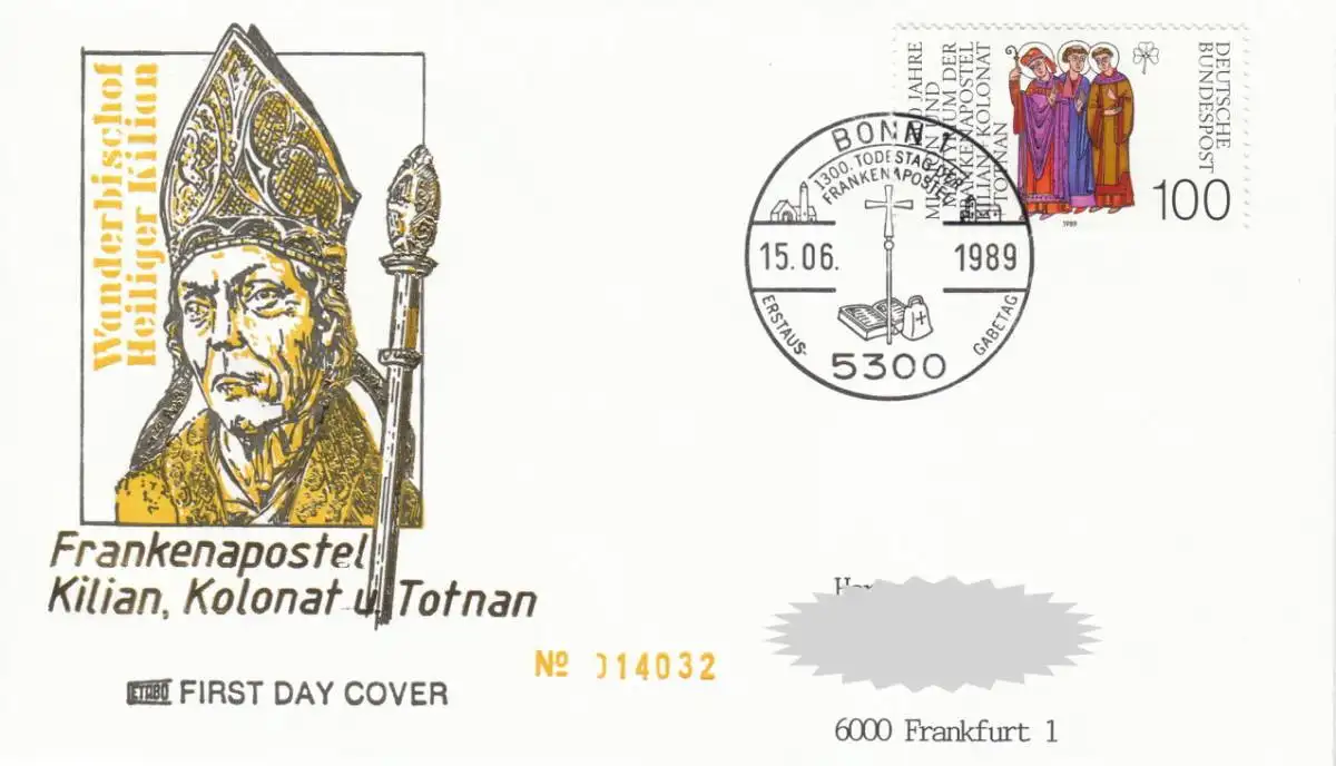 FDC: 1300. Todestag der Frankenapostel Kilian, Kolonat und Totnan: Die Heiligen Kilian, Kolonat und Totnan († 689), iro-schottische Wandermönche