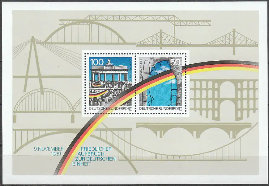 Blockausgabe: 1. Jahrestag der Öffnung der innerdeutschen Grenzen und der Berliner Mauer: Friedlicher Aufbruch zur deutschen Einheit: Durchbrochene Mauer / Szene am Brandenburger Tor