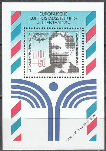 Blockausgabe: Europäische Luftpostausstellung LILIENTHAL ’91, Dresden; 100. Jahrestag des ersten Flugversuches von Otto Lilienthal: Otto Lilienthal (1848-1896), Flugpionier; Lilienthal-Gleiter Nr. 13