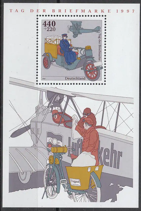 Blockausgabe: Tag der Briefmarke: Historisches Flugzeug und dreirädriger Motorwagen für den Posttransport