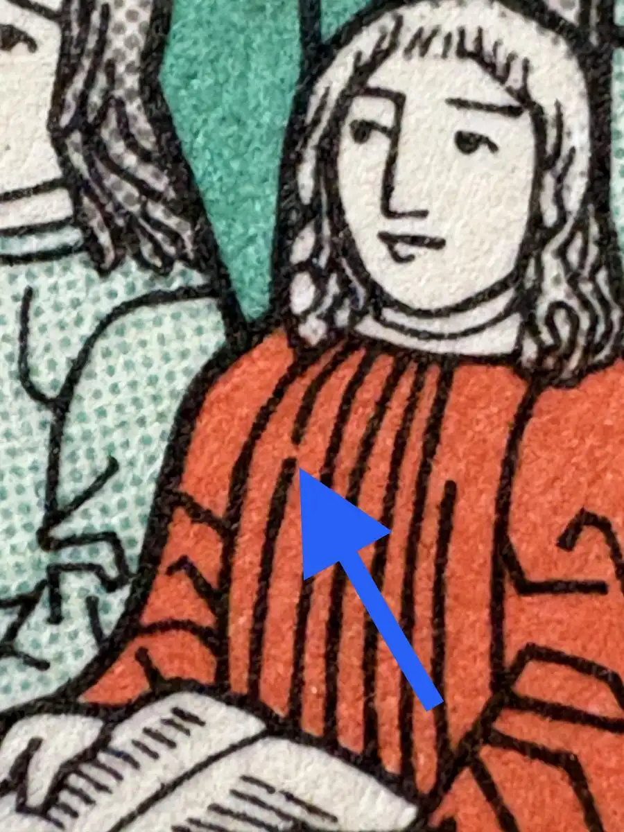 Plattenfehler: Philotax: 153-XX9: Roter Kittel der mittleren Person gebrochen; BF 49, A Bogen (auf verschiedenen Feldern).