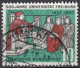 500 Jahre Universität Freiburg: Dozent vor Studenten; Wiedergabe aus der Freiburger Sapienshandschrift (15. Jh.)
