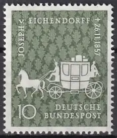 100. Todestag von Joseph Freiherr von Eichendorff (1788-1857), Dichter: Postkutsche, Hintergrund Eichenlaub; Illustration zur Novelle „Aus dem Leben eines Taugenichts“
