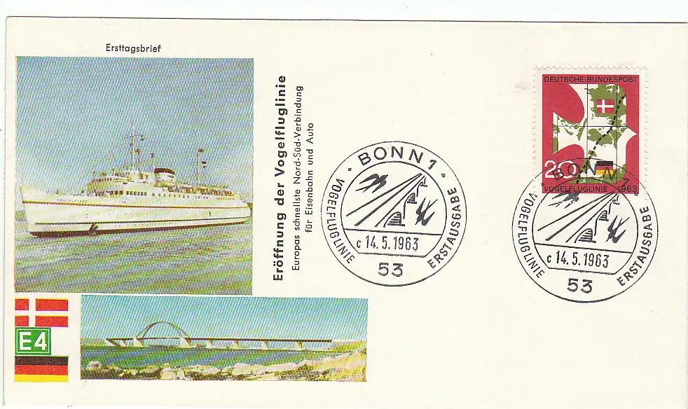 FDC: Einweihung der „Vogelfluglinie“ (kürzeste Verbindung zwischen Deutschland und Kopenhagen): Im Vogelumriss Landkarte mit Linienführung der „Vogelfluglinie“, Flaggen von Dänemark und der Bundesrepublik Deutschland