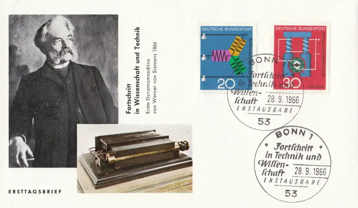 FDC: Fortschritt in Technik und Wissenschaft (II): 75 Jahre Drehstromübertragung, 100 Jahre Dynamo: Drehstromleitung / Dynamo von Werner von Siemens (1816-1892), Begründer der Elektrotechnik