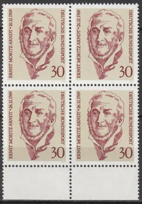 200. Geburtstag von Ernst Moritz Arndt: E. M. Arndt (1769-1860), Dichter und polit. Schriftsteller - Hinweis: Block hat vorwiegend im Randstück unten rechts einen leichten Knick.