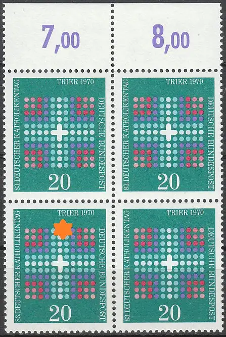 Deutscher Katholikentag, Trier: Farbige Punkte, Kreuz - Philotax Nr. DE0545-001: Türkisfarbener Strich über dem ersten "K" von "KATHOLIKENTAG", BF 17. Dieser Fehler befindet sich auf der Marke unten links.