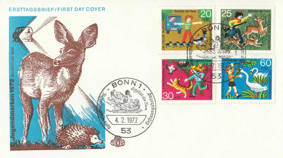 FDC: Jugend: Tierschutz: Junge schützt Enten auf der Straße / Junge als Unruhestifter im Wald / Mädchen schützt Vögel vor einer Katze / Junge reizt Schwäne