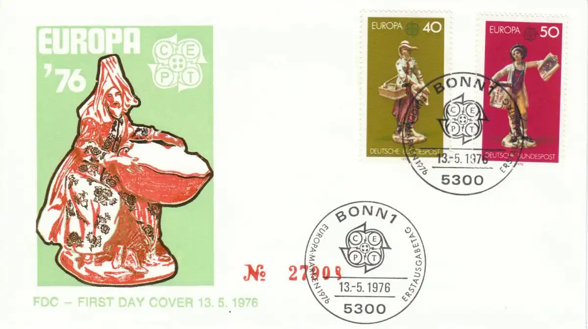 FDC: Europa: Kunsthandwerk: Erzeugnisse der Porzellanmanufaktur Ludwigsburg (um 1765): Straßenhändlerin mit Bijouterien und Kupferstichen / Straßenhändler mit Kupferstichen