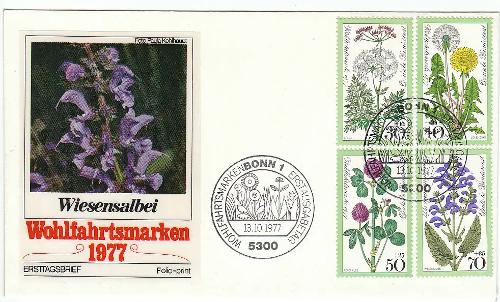 FDC: Wohlfahrt: Wiesenblumen: Kümmel (Carum carvi) / Löwenzahn (Taraxacum officinale) / Roter Klee (Trifolium pratense) / Wiesensalbei (Salvia pratensis)