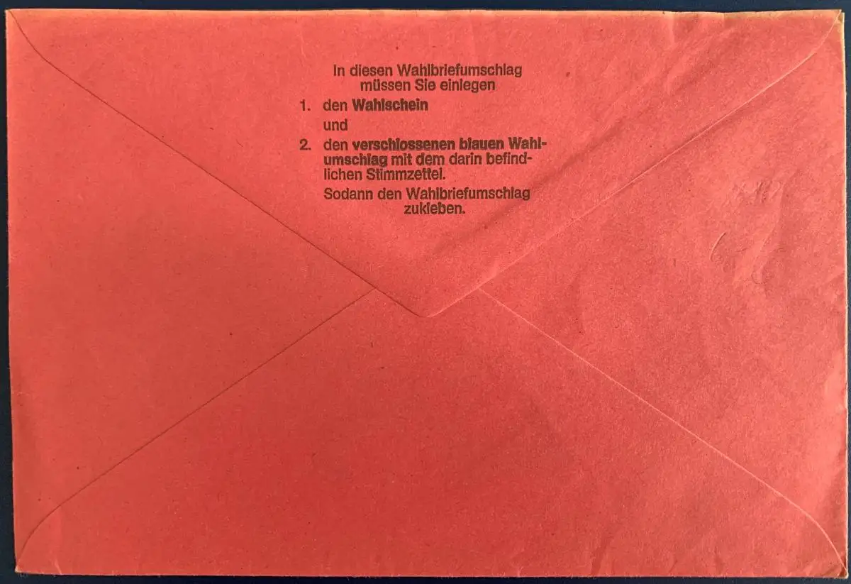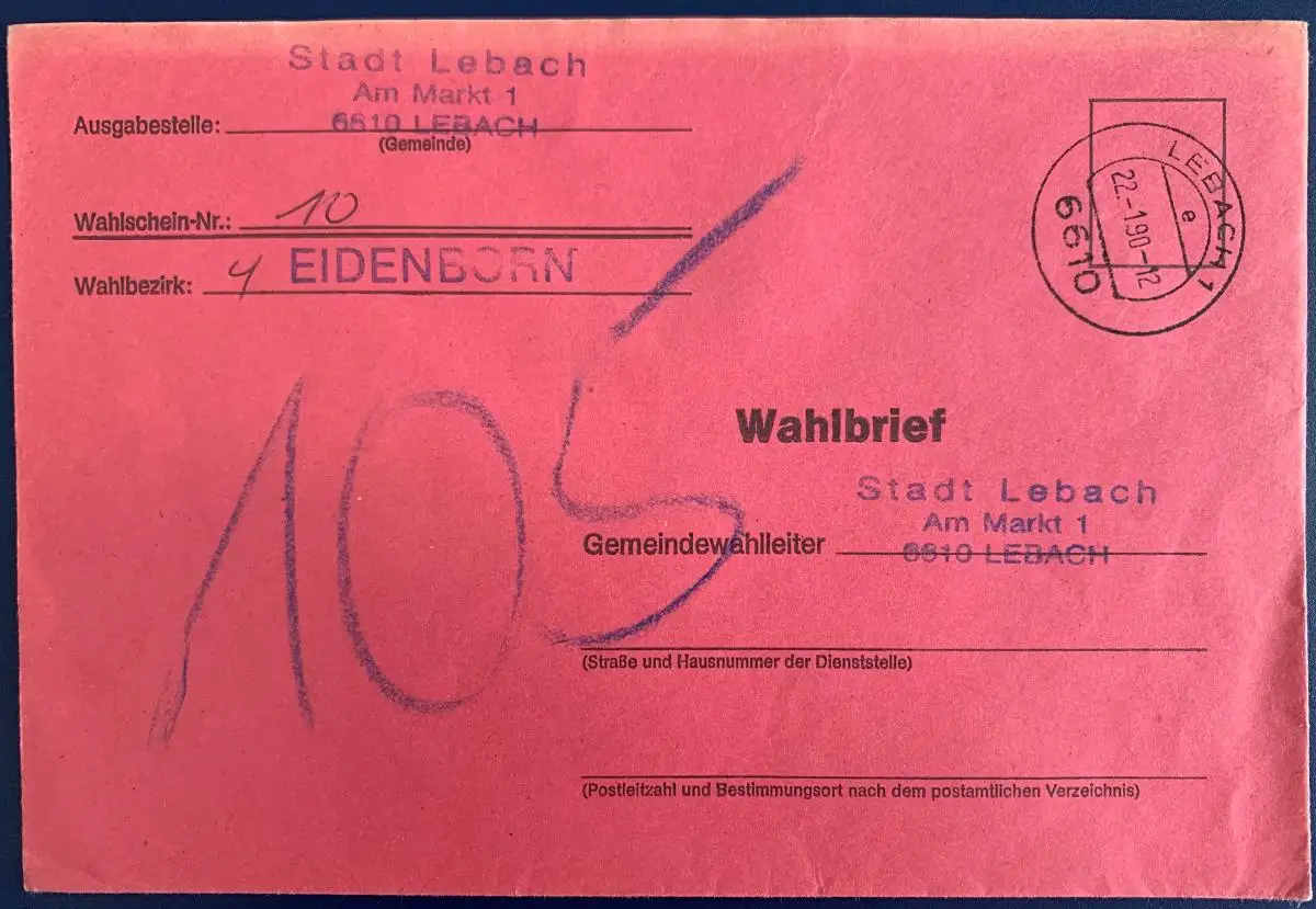 Wahlbrief, gelaufen mit Poststempel vom 22.01.1990 in der Stadt Lebach, zur Saarländischen Landtagswahl 1990.