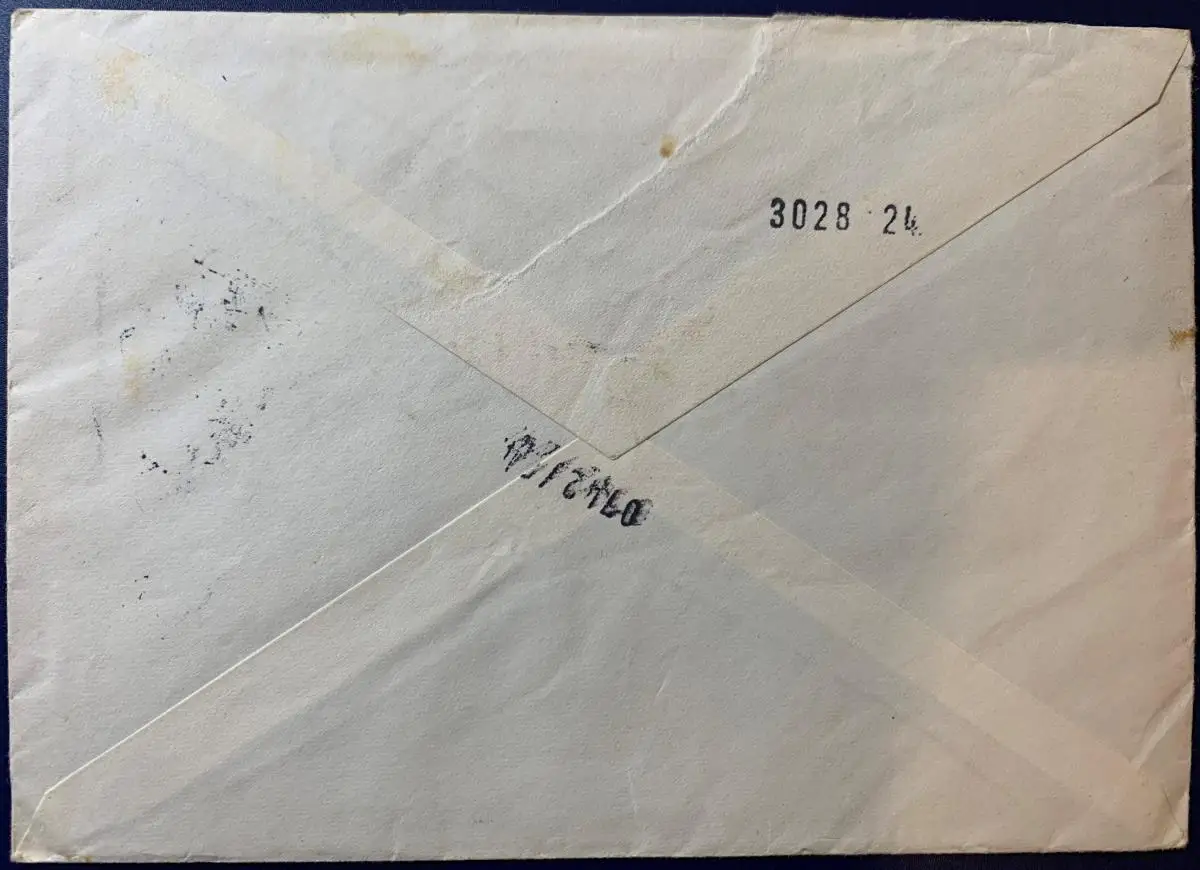 Expressbrief, frankiert mit Mi.Nr. 334 (Dreier- und Zweierblock), entwertet mit Poststempel vom 24.03.1960, gelaufen von Bonn nach Marano Vicentino/Italien. Brief leicht fleckig, ansonsten gute Erhaltung.