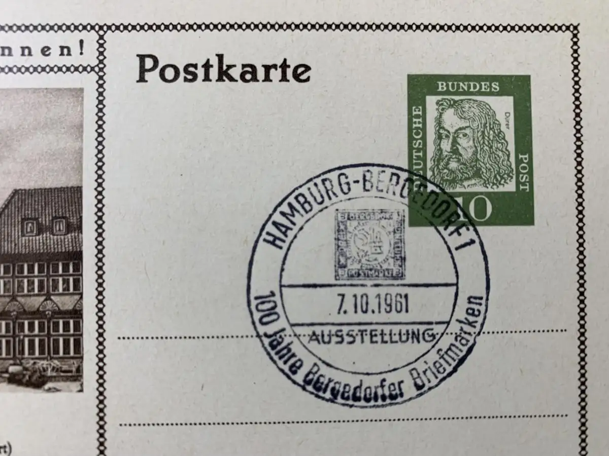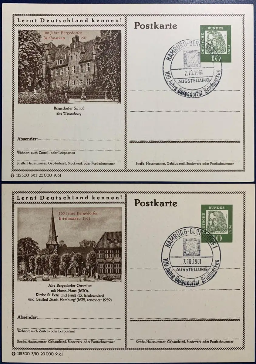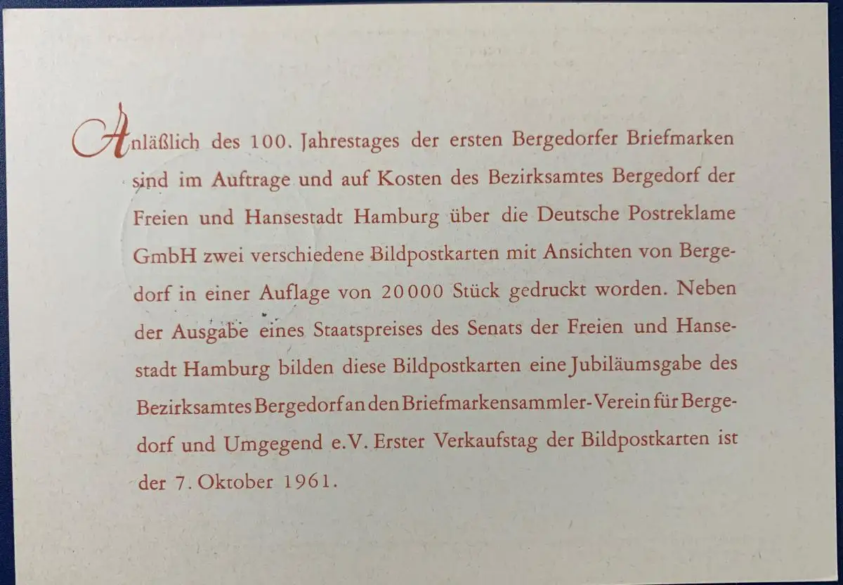 Beide Karten wurden anläßlich "100 Jahre Bergedorfer Briefmarken" in einer Auflage von jeweils 20.000 Stück mit Aufdruck auf der Vorderseite, sowie einem aufgedruckten Text auf der Rückseite herausgegeben. Erster Verkaufstag war der 07.10.1961 - siehe Datum des Sonderstempels!