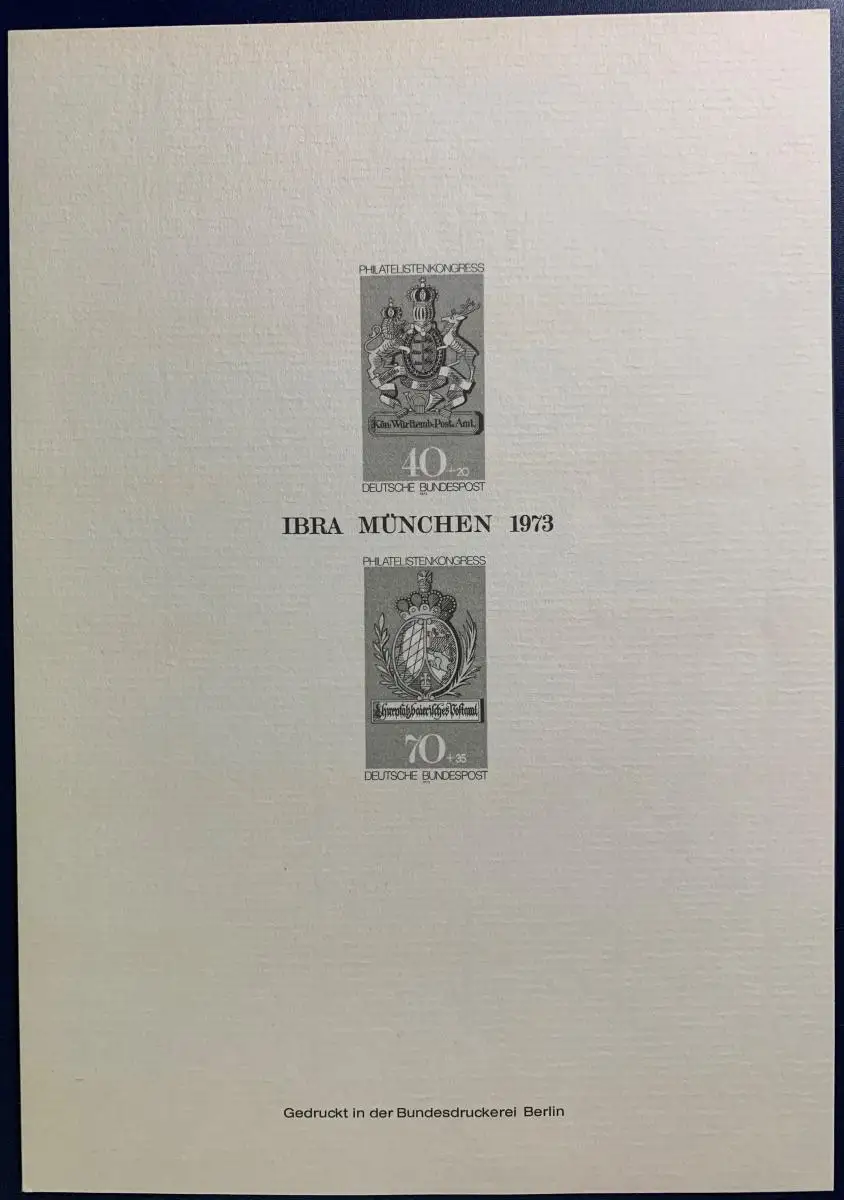 Schwarzdruck von Block 9 "IBRA München 1973", großformatiger (205 x 143 mm), offizieller Schwarzdruck der Bundesdruckerei Berlin auf hochwertigem Kartonpapier, ausgezeichnet erhalten!