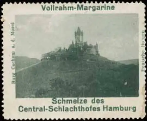 Serie: Deutsche Burgen, Vollrahm-Margarine, Schmelze des Central-Schlachthofes, Größe/Zustand: 4x6 , beschädigt, Original alte Reklamemarke die seinerzeit für die Werbung benutzt wurde