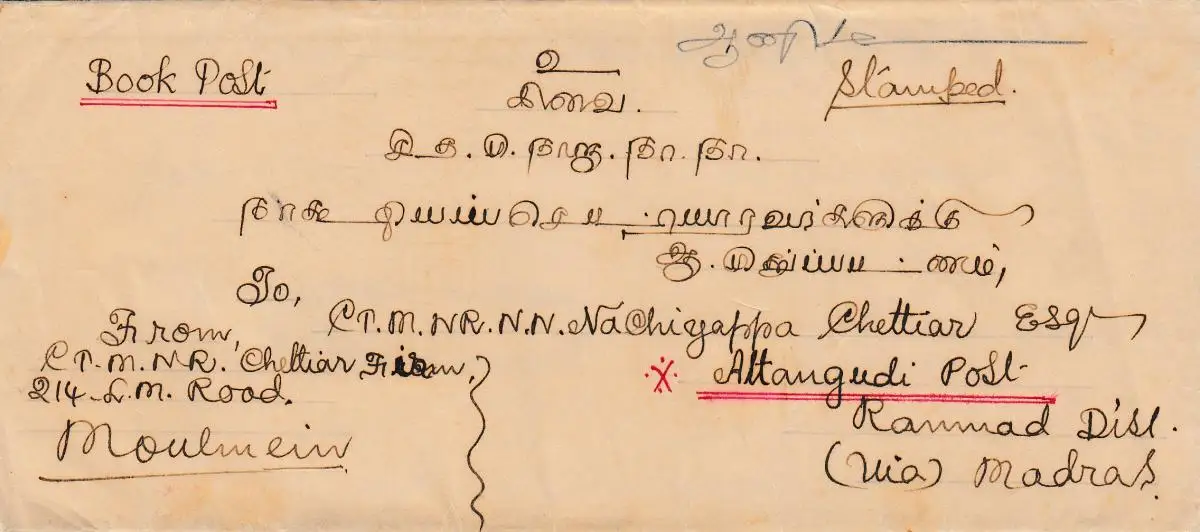 Burma 1937: book post Moulmein to Attangudi, Ranmad via Madras