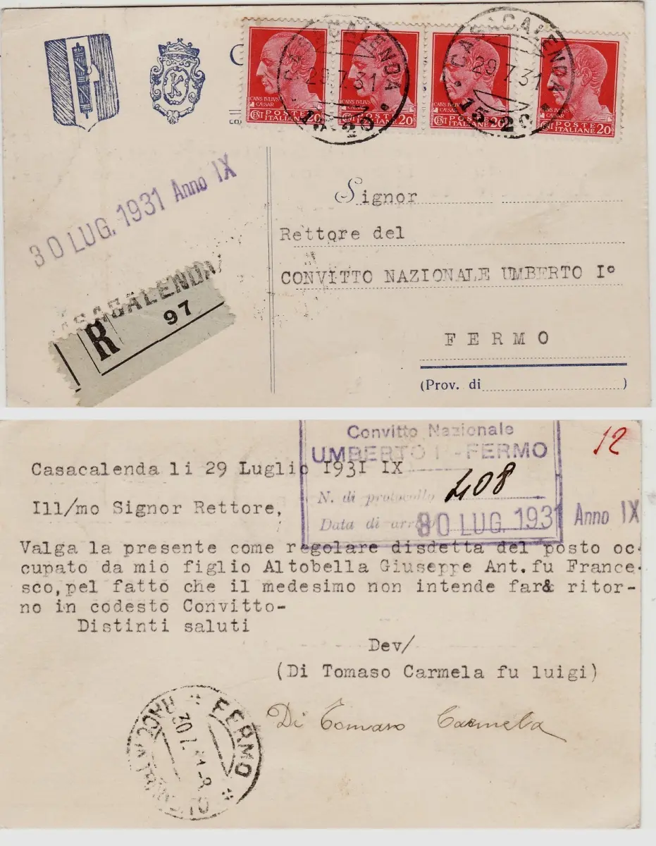 #CASACALENDA 1931 RACC. AL CONVITTO UMBERTO I DI FERMO
