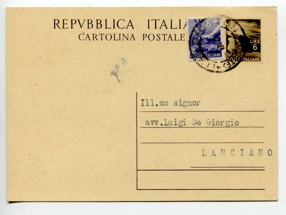 C.P. Lire 6 Democratica Nr. C 138 mit beigefügten Marken - C.P. Lire 6 Democratica Nr. C 138 mit zusätzlichen Marken Nr. 556 (Tarif 12 Lire) gereist von Ortona nach Lanciano am 11.2.49 - sehr guter Erhaltungszustand Code 902/7