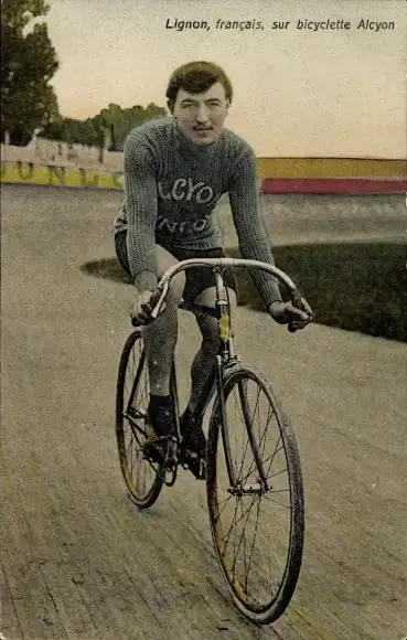 CPA Cycliste Lignon, français, sur bicyclette Alcyon