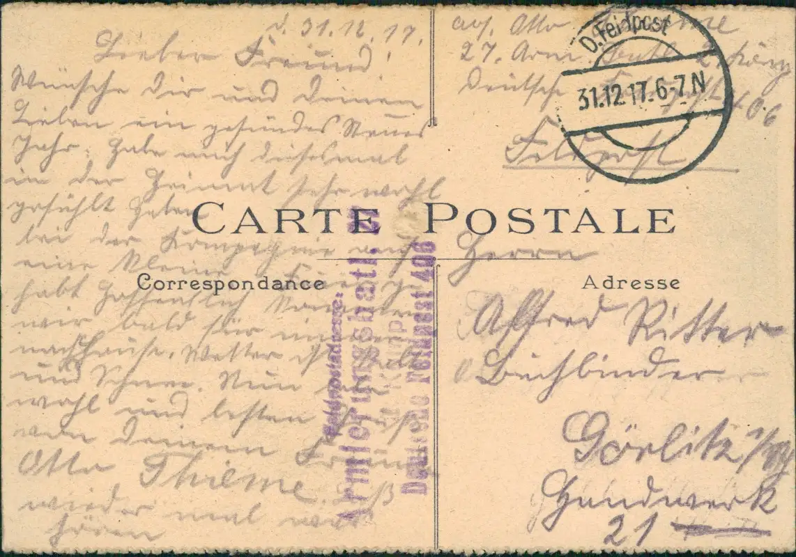 1. Weltkrieg Dt. Feldpost gelaufen (Blindstempel)