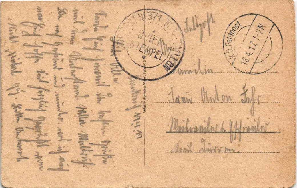 1. Weltkrieg als Feldpost gelaufen (dt. Feldpoststempel)