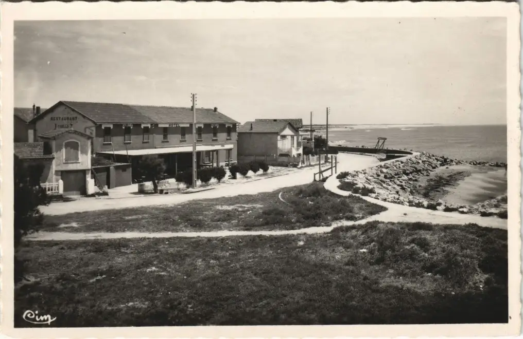 CPA Saintes-Maries-de-la-Mer Ortsansicht, Küste mit Gebäude 1950