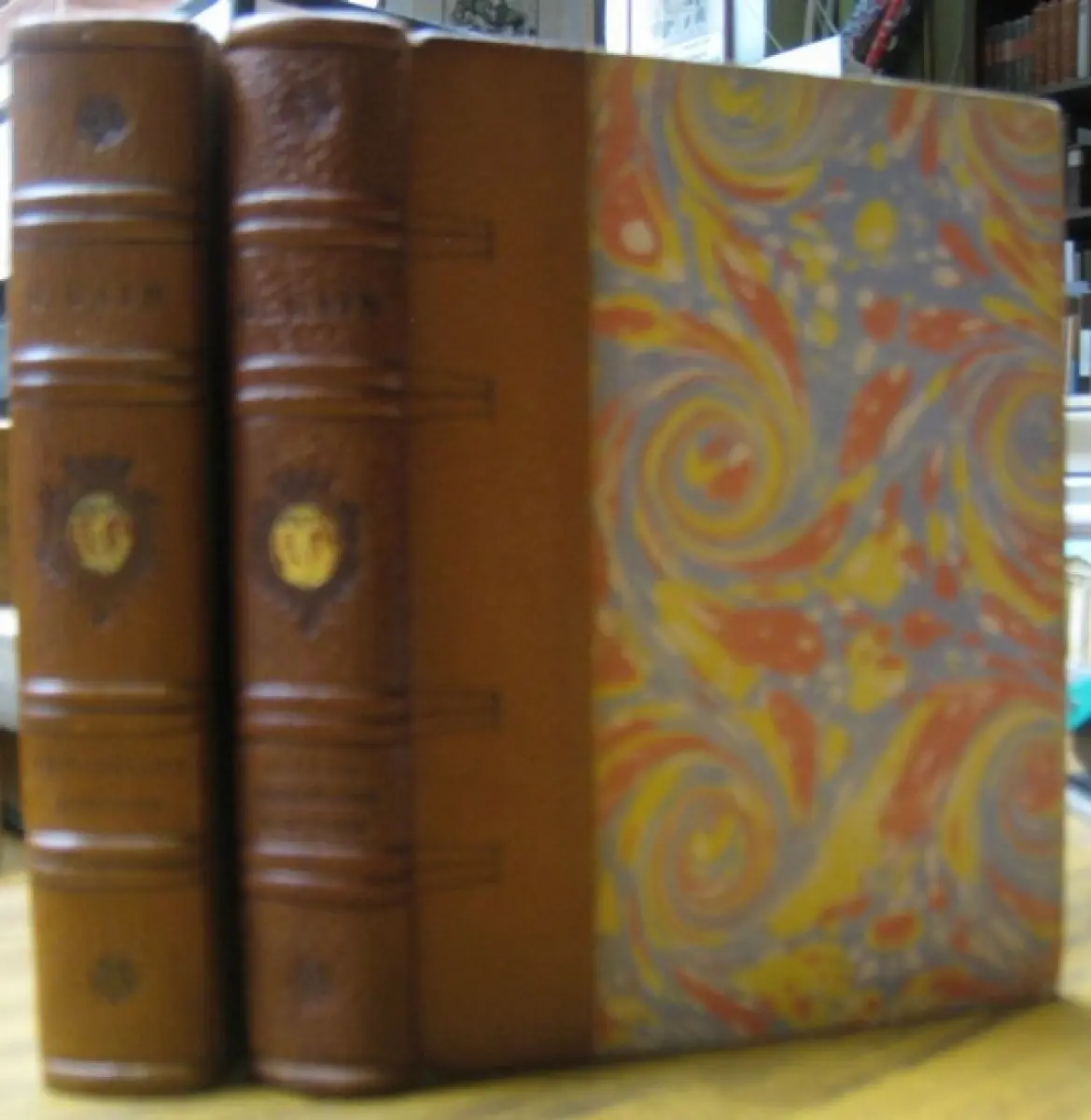 Freie Beschreibung: 8°, Deux reliures demi-cuir contemporaines avec titres et ornements au dos gaufrés en noir, chacune ornée d'une illustration multicolore au dos. Couvertures marbrées de couleur (le dos du tome 2 présente quelques taches blanches), tranches dorées et rubans signets. 404/414 (2) pages avec de nombreuses illustrations monochromes dans le texte et sur les planches. Le tome 2 comprend également la couverture originale de la brochure. Tome 1 : Signature à l'encre ancienne sur la page de garde, quelques taches jaunes sur l'ensemble du tome, tandis que le tome 2 est légèrement bruni sur les tranches. Bon exemplaire dans l'ensemble. -- Zwei Halblederbände der Zeit mit schwarzgeprägtem Rückentitel und -schmuck sowie je einer mehrfarbig geprägten Rücken-Illustration. Farbig marmorierte Deckel (Hinterdeckel von Band 2 ist etwas weißfleckig) und Vorsatzpapiere, Kopfgoldschnitt, Lesebändchen. 404 / 414 (2) Seiten mit zahlreichen einfarbigen Abbildungen im Text und auf Tafeln. Band 2: hier ist auch der Umschlag der Originalbroschur mit eingebunden. Band 1: Namenszug in alter Tinte auf dem Vorsatz, durchgehend etwas gelbfleckig, Band 2 nur leicht randgebräunt. Insgesamt gutes Exemplar