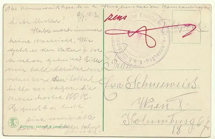 Bemerkungen: Gelaufen mit Stempel. K.u.K. Militärbevollmächtiger Konstantinopel/Wappen/Hwghstelle. Zweikreisst. violett. Durchmesser 38 mm. Zehelner/01/013-P140 & Zensurvermerk rot,. Datum handschriftlich 9. 2. 1917.