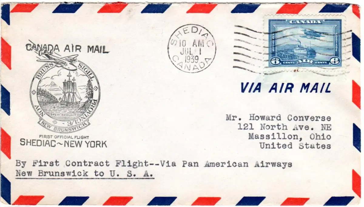 Canada 1939, SHEDIAC-New York 1st.-Flight cover with 6 C.