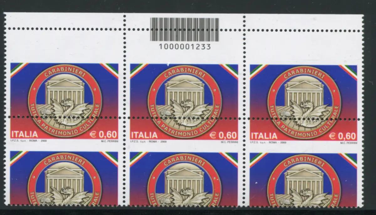 Comando Carabinieri Barcode Sorte Vollgummi - Comando Carabinieri Nr. 3083 Sechserblock b. von f. mit stark vertikal verschobener Verzahnung - Ein Exemplar trägt die Barcode-Nummern in der Vignette (Kat. Einheitsnr. 3135Ba + 3135Da) - Kat. 705 Code 826/3
