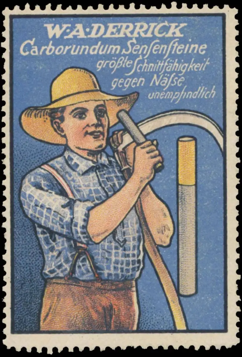 größte Schnittfähigkeit gegen Näße unempfindlich, Gärtner schärft die Sense, Größe/Zustand: 6x4 , guter Zustand, Original alte Reklamemarke die seinerzeit für die Werbung benutzt wurde