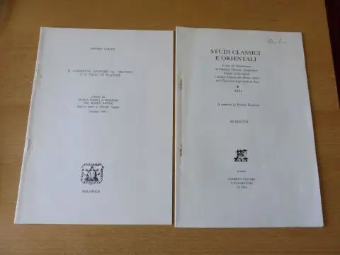 Carlini, Antonio: 2 TITELN v. A. CARLINI : "TESTIMONE E TESTO: IL PROBLEMA DELLA DATAZIONE DI PIand I 4 DELL PASTORE DI ERMA" aus STUDI CLASSICI E ORIENTALI Pisa, 1992 S. 17-30 mit 4 Abb. auf 2 Tafeln (Papyrologie) // "IL COMMENTO ANONIMO AL ` TEETETO ` E