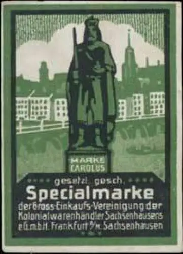Marke Carolus-Specialmarke der Gross-Einkaufs-Vereinigung der Kolonialwarenhändler Sachsenhausens e GmbH, Größe/Zustand: 6x4 , guter Zustand, Original alte Reklamemarke die seinerzeit für die Werbung benutzt wurde