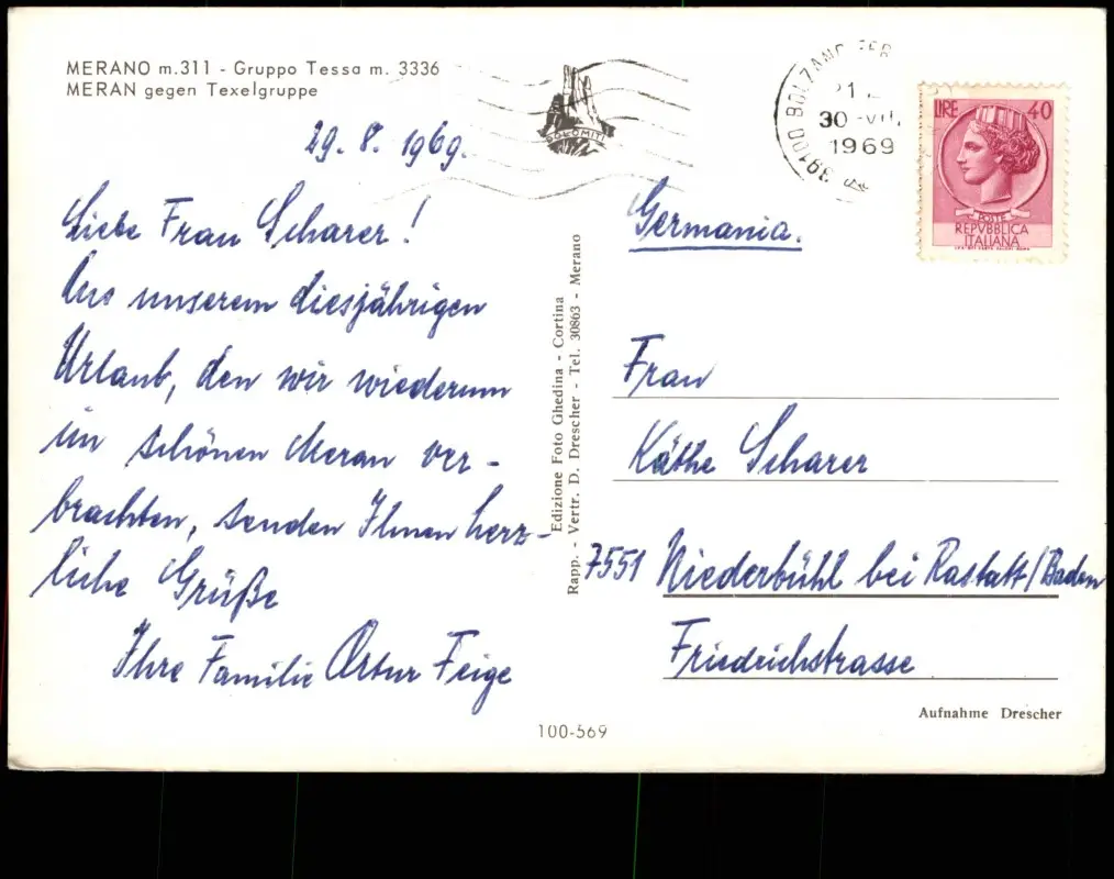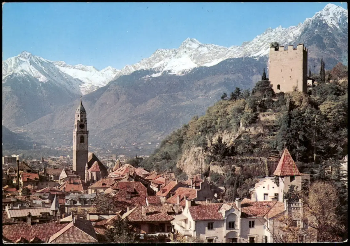 Cartoline Meran Merano Panorama-Ansicht gegen Texelgruppe 1969