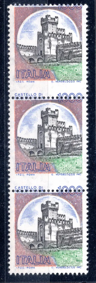 Vollgummi - Castelli Lire 1.000 Nr. 1527 vertikaler Dreierstreifen mit starker und fortschreitender Verschiebung des horizontalen Kammbohrers, so dass zwei Exemplare unten statt oben den Schriftzug Schloss zeigen und das letzte Exemplar viel kürzer ist ohne Schriftzug und Nennwert - Selten nur fünf Notenstreifen aus einem Blatt - Nr. 648/L