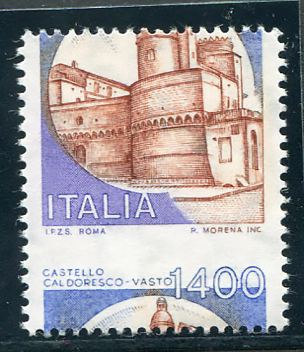 Castelli Lire 1.400 Sorten verschobene Verzahnung Vollgummi - MHN - - - Castelli Lire 1.400 Nr. 1527A horizontale Verzahnung stark verschoben, so dass Schlossname und Wert niedrig statt hoch sind - wertvolle Sorte für diesen Wert in 50-fach Bogen gedruckt Cod. 739/14