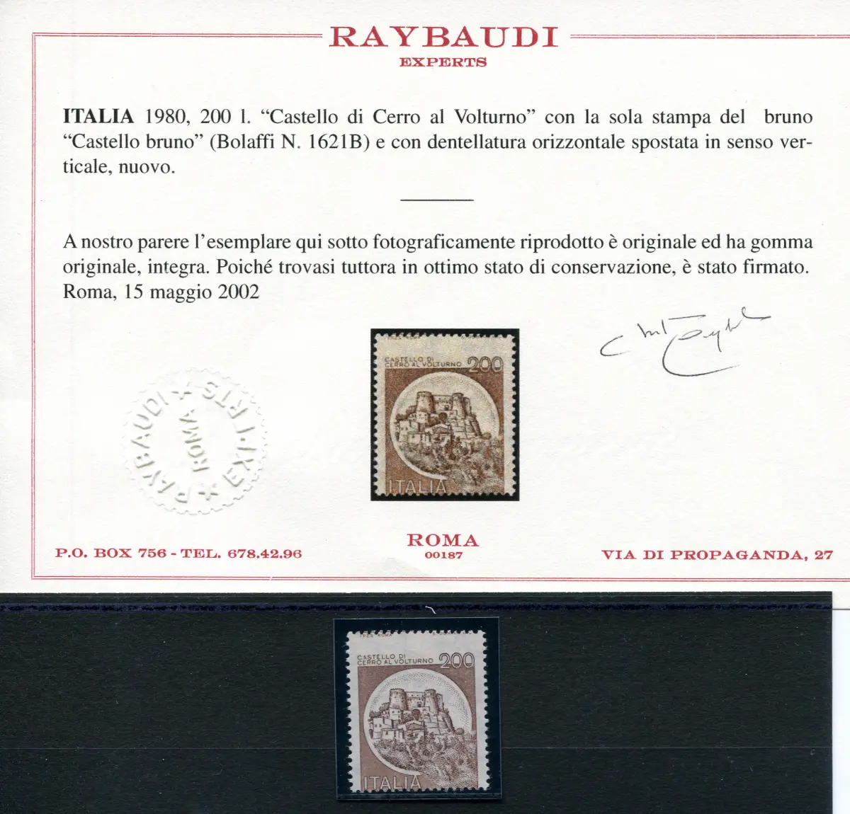 Castelli Lire 200 Sorten NATURALE BOLAFFI Vollgummi MNH - Castelli Lire 200 Nr. 1516 mit nur braunem Druck und verschobener horizontaler Verzahnung - Naturmarke Volturno Bruno (Kat. Bolaffi Nr. 1621B) - Selten mit leichter Zahnverschiebung - Zert. Ray. Cod. 583/16