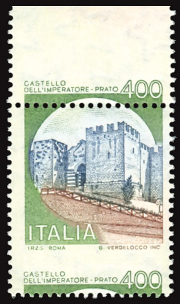 Castelli Lire 400 Sorte verschobene Verzahnung Vollgummi MNH - Castelli Lire 400 Nr. 1520 wunderschöner b. von f. oben mit stark nach unten verschobener horizontaler Verzahnung (Sass. spec. Nr. 1137 Ec) - da es aus der ersten horizontalen Reihe des Blattes stammt, wird am Rand der Schriftzug Kaiserburg 400 wiederholt - Ungewöhnlich Cod. 601/16