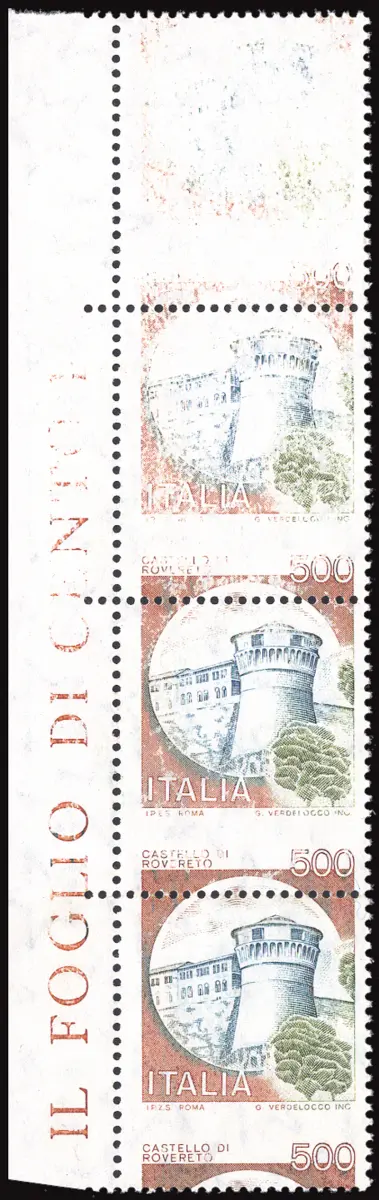 MNH - Vollgummi - - Castelli Lire 500 Nr. 1522 vertikaler Streifen von vier Exemplaren b. von f. mit stark verschobenen horizontalen Verzahnung, so dass der Name des Schlosses und der Wert unten statt oben liegen - die beiden oberen Exemplare mit stark verblassendem Druck - auffällig und selten Cod.721/182