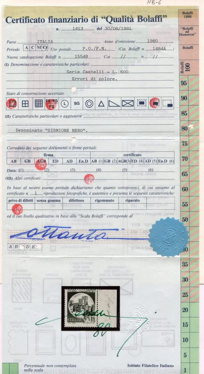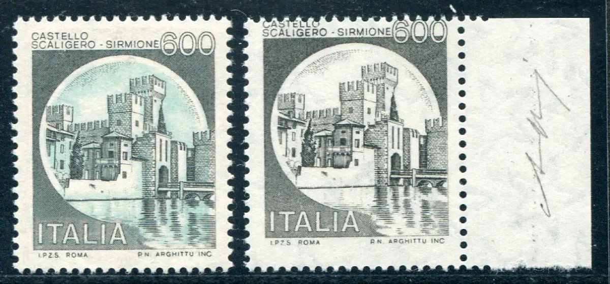 Castelli Lire 600 Sirmione schwarz Sorte Bolaffi Vollgummi - MHN - - - Castelli Lire 600 Sirmione schwarz die Naturmarke ohne Druck des Grüns b. von f. (Kat. Bolaffi Nr. 1628 B) - Selten - Zert. Bolaffi 80 % Cod. 721/14