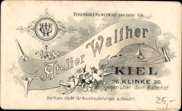 Zustand, siehe Scan, ungelaufen- Fotograf Atelier Walther, Kiel, Klinke 26 - ca 6 cm X 11 cm