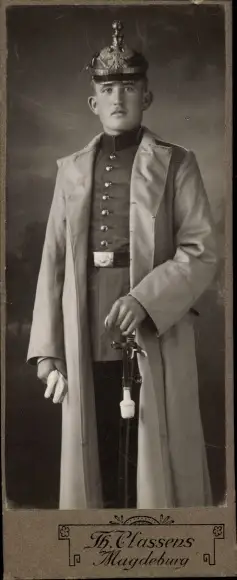 CdV Deutscher Soldat in Uniform, Mantel, Pickelhaube, Portrait