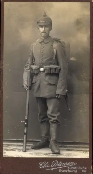 CdV Deutscher Soldat in Uniform, Pickelhaube, Gewehr, Marschausrüstung
