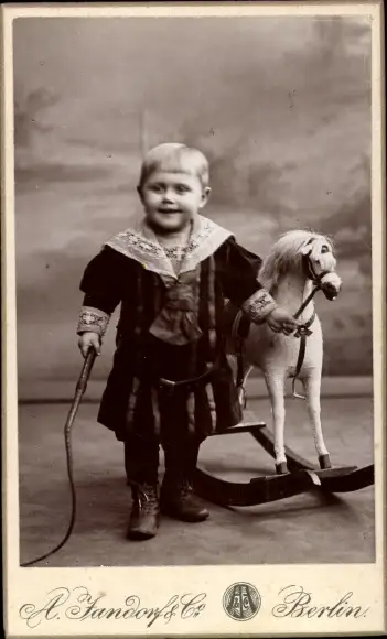 CdV Kinderportrait, Kleinkind mit Schaukelpferd, Peitsche